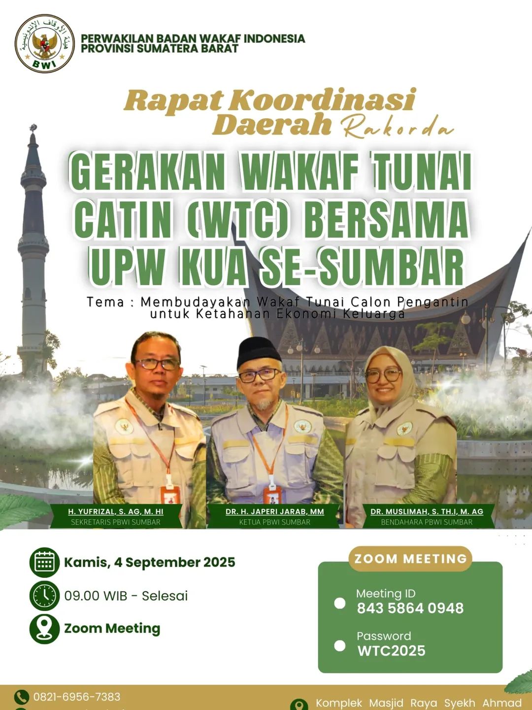 PADANG- Perwakilan Badan Wakaf Indonesia (BWI) Provinsi Sumatera Barat akan menggelar Rapat Koordinasi Daerah (Rakorda) bertema “Gerakan Wakaf Tunai Calon Pengantin (WTC) Bersama UPW KUA se-Sumbar” pada Kamis, 4 September 2025. Acara yang berlangsung secara virtual melalui platform Zoom Meeting ini mengusung tema besar “Membudayakan Wakaf Tunai Calon Pengantin untuk Ketahanan Ekonomi Keluarga”.(Rabu, 03/09/25).